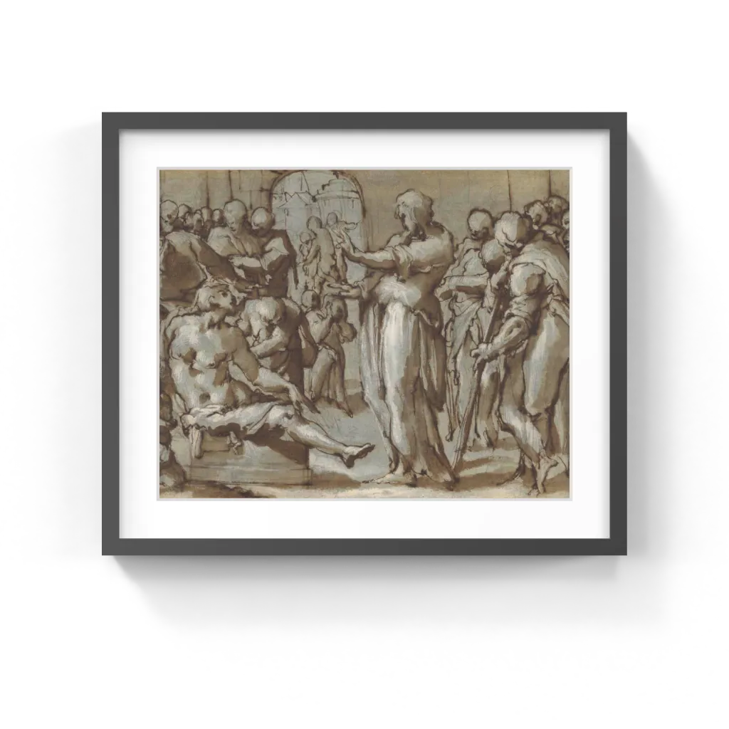 Giovanni Battista Naldini (Italian, about 1537–1591) As Christ and his disciples approach the town of Nain in Galilee, they meet the funeral procession of a young man, followed by his widowed mother. Pitying the poor woman, Christ lifts one hand towards the bier, and the body of the man comes to life. In front of an arched gateway leading into the town, a crowd gathers around Christ and the dead man as he prepares to rise by stretching out one leg. Giovanni Battista Naldini presented the dramatic conclusion to a miracle found in Saint Luke's Gospel. He sketched the scene quickly with pen and brown ink, focusing on the huddled mass of figures rather than the details of individual faces. Dark strokes of brown wash give depth and form to the shapes, while white heightening creates highlights on the muscular naked body of the dead man, on Christ's lower robes, and on other figures in the foreground. Naldini made this drawing as a preparatory sketch for an altarpiece for a church in Florence.