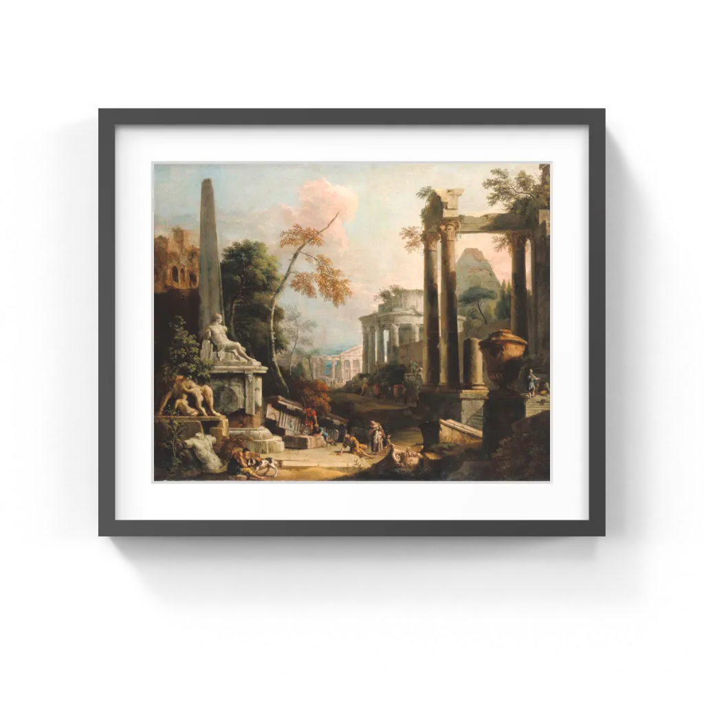 Marco Ricci (Italian, 1676–1730); and Sebastiano Ricci (Italian, 1659–1734) In this fantastic vista, Marco Ricci combined ancient Roman monuments, such as an obelisk, sections of temples, and statues, to create a scene both picturesque and evocative of the power of the ancient world. In the last decade of his life, Ricci specialized in such theatrical views and repeatedly used the same monuments in different arrangements. As usual, his uncle Sebastiano Ricci painted the rustic figures, which are nearly lost amidst the colossal ruins.