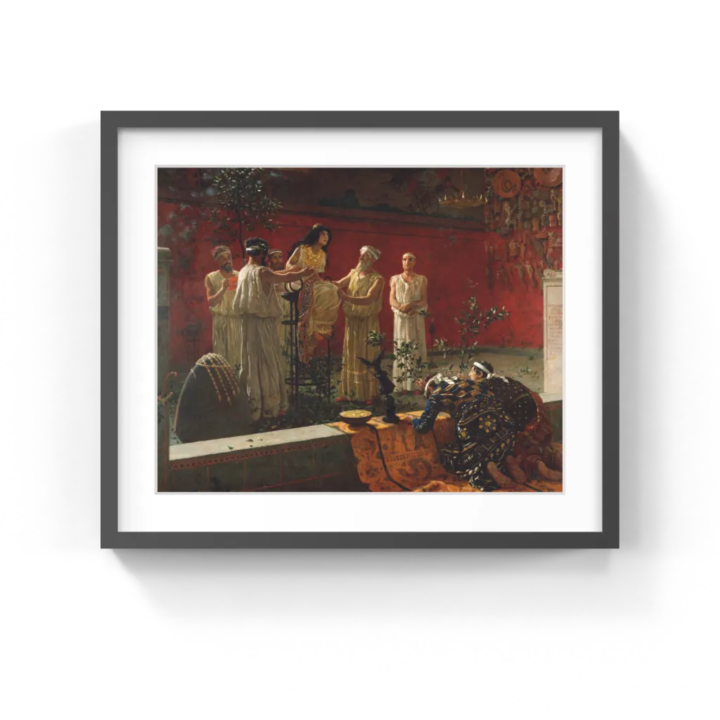 Camillo Miola merged academic and classical traditions to construct his view of the classical past. He filled the canvas with seemingly archaeologically accurate costume, architecture, and furnishings, and painted in a highly detailed style to create an ancient world that appears fully real.