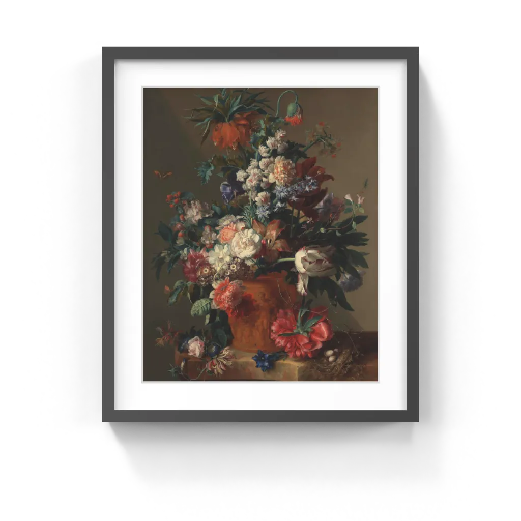 Van Huysum painstakingly applied layer upon layer of thin oil glazes to capture the brilliant colors and delicate textures of the blossoms. Because each flower could only be painted while in season, it sometimes took the artist several years to complete a single painting.