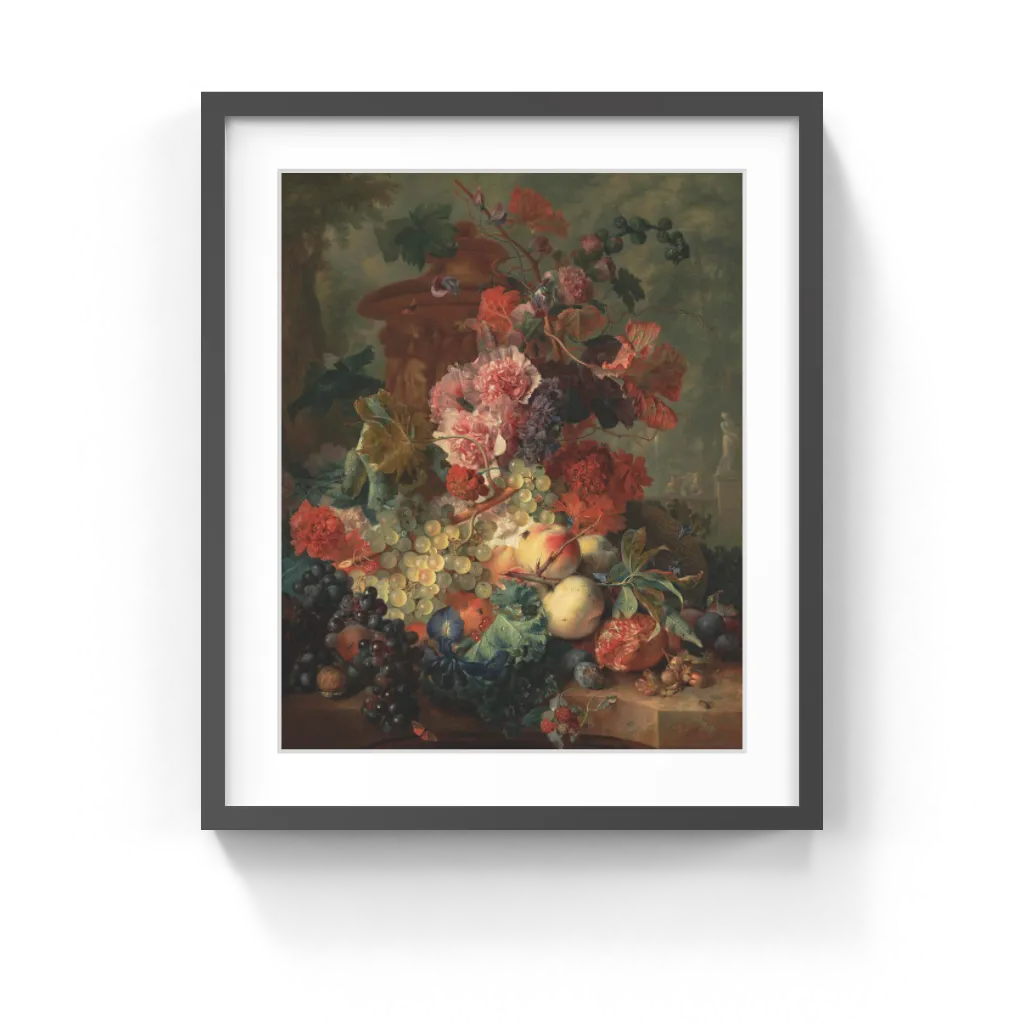 Jan van Huysum (Dutch, 1682–1749) In what may be a companion piece to the Getty Museum's Vase of Flowers, Jan van Huysum combined the lustrous realism of seventeenth-century Dutch paintings with the bright colors characteristic of the eighteenth century in a lavish still life of fruit and flowers. The asymmetrical arrangement of bursting and overripe fruit spills over onto the ledge, some falling prey to insects. Flowers droop under the weight of their extravagant blooms. Van Huysum deftly rendered the translucence of the grapes, the crisp surfaces of the leaves, and the wiry texture of the vines.