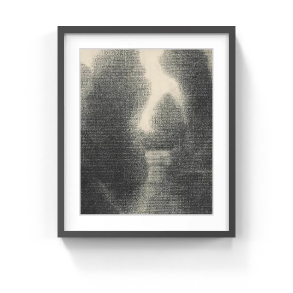 Charles Angrand (French, 1854–1926) The drawing represents a clearing surrounded by trees. The site's location is not identified. Using the greasy medium of Conté crayon, Angrand had created a subtle tonal image. By stumping the medium extensively, he has achieved a soft atmosphere where forms are suggested rather than precisely defined. Using the contrast between the areas of paper left in reserve and those where he has applied Conté crayon, Angrand creates a mysterious landscape that is bathed in a poetic light.