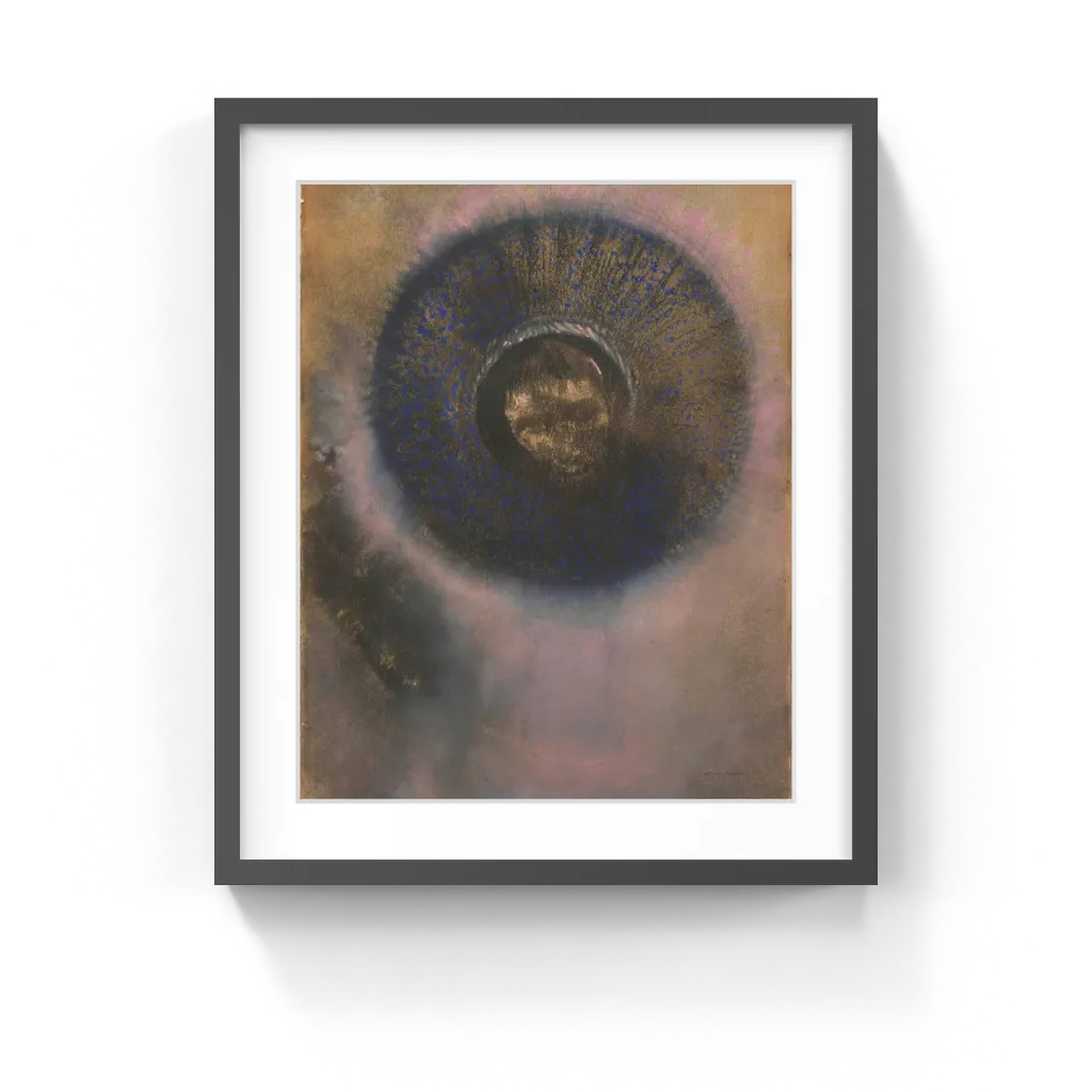 Odilon Redon (French, 1840–1916) A large nimbus floats in a glowing cosmic space. Its black circular center is a male head, partly shadowed and with eyes closed, sunk in deep dreaming sleep. The nimbus is rendered in delicate strokes of powdery charcoal over which Redon has added dots of cobalt blue pastel.