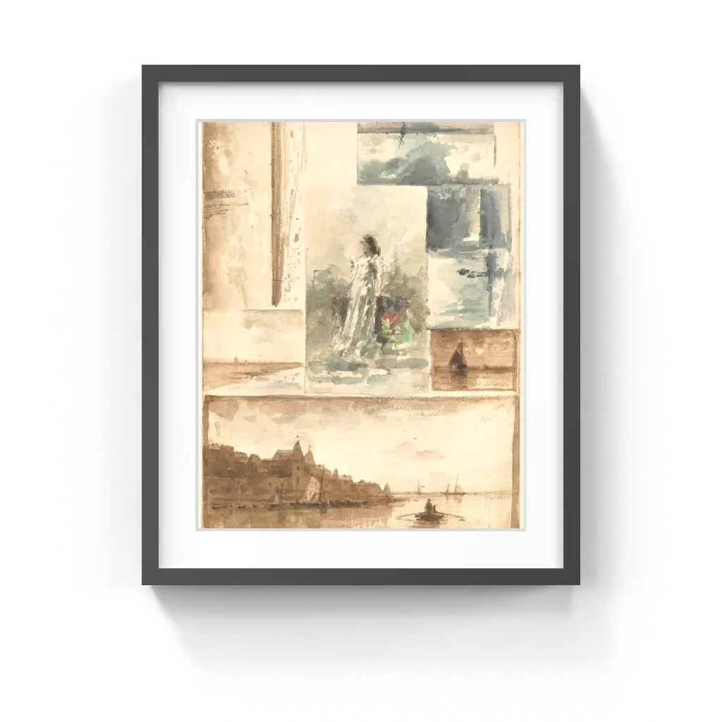 Alfred Stevens (Belgian, 1823–1906) This watercolor contains eight discrete designs on a single sheet of paper: a vertically-oriented scene at center portrays an elegantly dressed young woman reading a letter, while the seven surrounding vignettes offer views of the sea—beaches, a harbor, ships sailing by moonlight. The overall effect is that of a collage; the relationship, if any, between seascapes and reader is left to the imagination. Stevens made his name in the late 1860s and early 1870s as a painter of stylish domestic scenes; many of these feature young women reading letters (ostensibly from their suitors). From the 1880s onwards, respiratory problems frequently drove him to the Normandy coast, where he could breathe salt air and paint the sea. Therefore, although this sheet is not preparatory for any known composition—and the signature suggests the artist regarded it as a finished stand-alone work—it combines Stevens’s two primary interests as an artist.