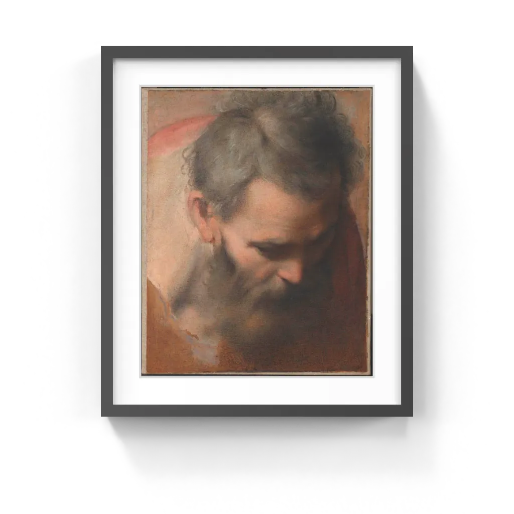 Federico Barocci (Italian, about 1535–1612) The present study is for the head of Saint Joseph in Federico Barocci's monumental altarpiece The Visitation, for the Chiesa Nuova, Rome. Extremely close to the head in the final painting, in which there are added wrinkles on Joseph's forehead, the sheet particularly explores the subtle interaction between color and light, while the lower chest and drapery dissolve into darkness. The use of this type of study, painted in oil on paper, was rare amongst the artist's contemporaries, but seems to have played a role in Federico's practice as he neared the completion of his paintings. The inventory made on his death records forty-two such studies ("pezzi di carte colorite a olio") of which fourteen were heads and the others landscapes and animals.