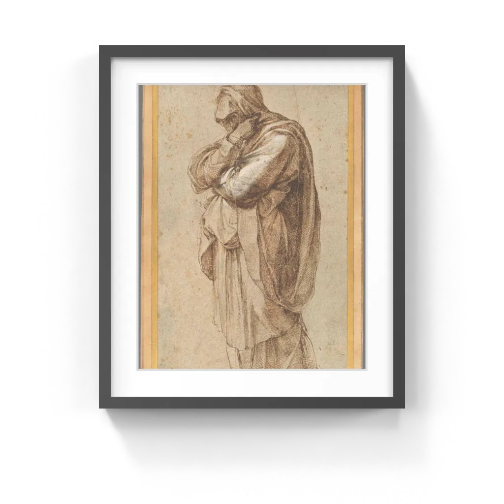 The figure appears to be dressed in a peplum, a full-length robe worn by women of antiquity as depicted in Renaissance painting. The pose and attitude of the woman is one that would typically have been found in a composition of the Deposition from the Cross or a Lamentation. No such project is known to have been undertaken by Michelangelo at this stage of his career yet early copies of this drawing indicate such a possibility.