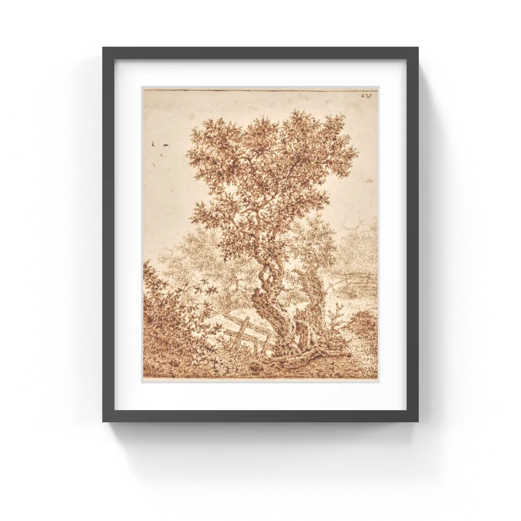 Claes van Beresteyn (Dutch, 1629–1684) This drawing depicts a swampy, overgrown dune with gnarled oak tree that dominates the entire sheet. Surrounding the base of the oak is a broken fence and thick bramble that creeps across the immediate foreground. Drawn in dark brown ink with a lightness and dryness of touch that is perfectly fitted to the teeming spikiness of the bramble and the oak's foliage, Knotty Old Tree in the Dunes with a Fence features a claustrophobically dense vegetation. The tree's majestic presence is enhanced by the soaring birds, who are dwarfed by its monumental scale.