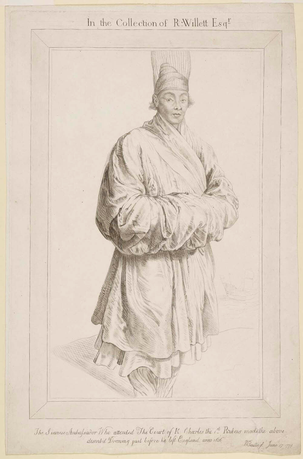 Captain William Baillie (British, 1723–1792); After Peter Paul Rubens (Flemish, 1577–1640) This engraving, produced by the amateur printmaker William Baillie in June 1774, is a nearly exact copy in reverse of the Getty Museum's drawing by Peter Paul Rubens. As the inscription along the base states, the drawing was made to commemorate a 1636 visit of the "Siamese Ambassador who attended The Court of K[ing] Charles the 1st." In the 1700s, copies of important works were engraved and distributed among a wide audience. A print such as this one promoted the collection of the drawing's owner, Mr. Willet. It also educated the public on the rare visit of an exotic individual more than one hundred and fifty years earlier. Prints were a vital form of propaganda, information, and portraiture in the era before photography.