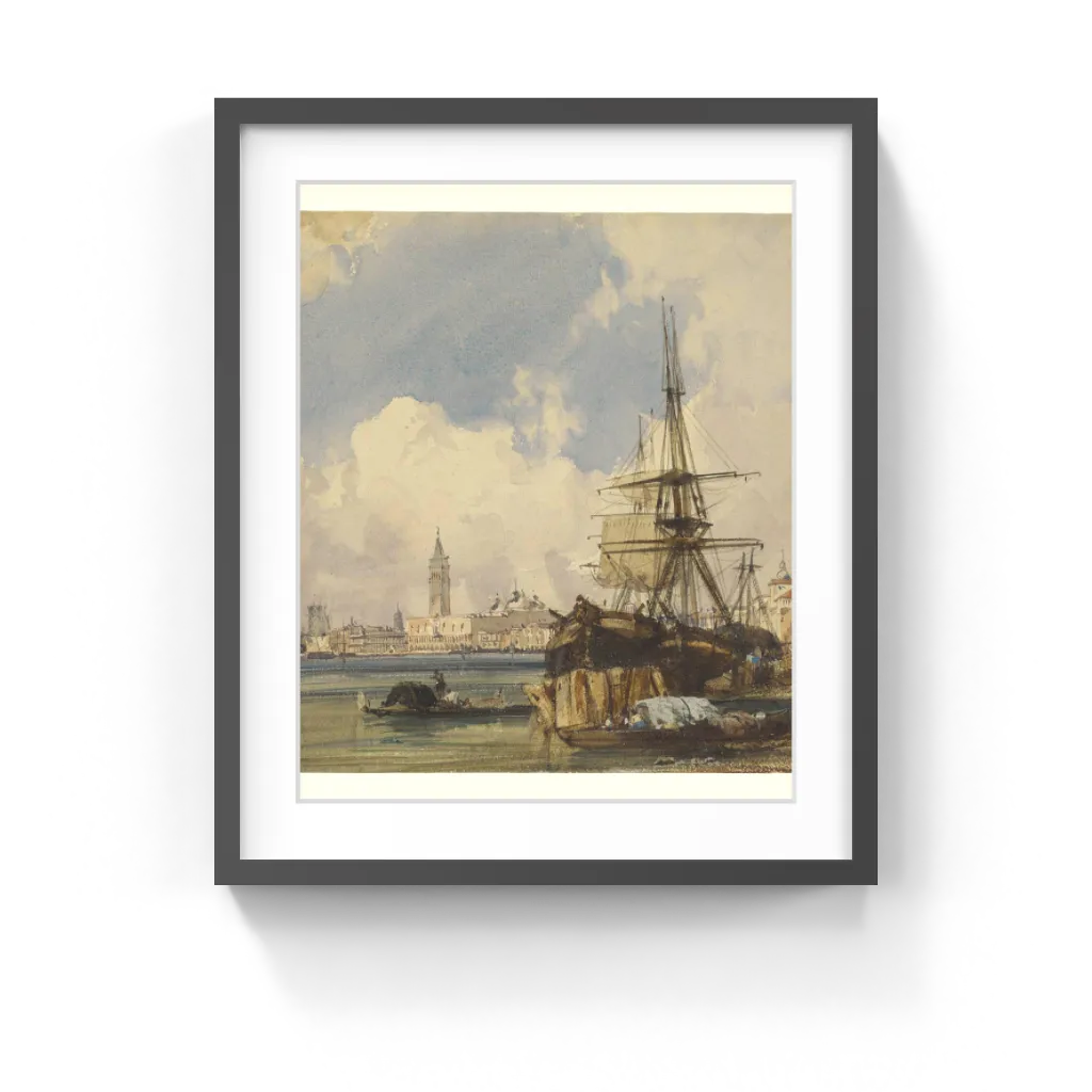 Richard Parkes Bonington (British, 1802–1828) With the distinctive Doge's Palace and the bell-tower of Saint Mark's at left, and several large ships docked at right, the composition represents a view taken from the waterfront close to the church of San Biagio and not far from the public gardens in Venice. By relegating the city's famous architecture to the background, and giving dominance to the foreground shipping, Bonington reconceived the work of Canaletto and Guardi, instead recalling the maritime roots of Venice's power. Yet the view gives ample opportunity to showcase Bonington's renowned ability to capture the effects of light and water for which the city is so famous, with the trademark rendering of the calm lagoon and mobile clouds that became so influential on British and continental watercolor painting.