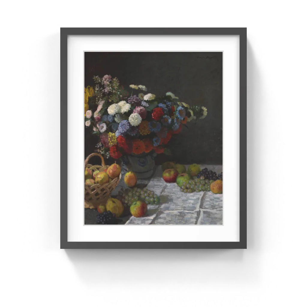 Claude Monet (French, 1840–1926) Although painted in his studio, this still life shows the influence of the outdoor experiments that Claude Monet undertook in the summer and fall of 1869, while he was living at Bougival on the Seine River. His exercises in different painting techniques are seen in the way he softened the outlines of forms and the manner in which he explored the descriptive possibilities of brushstrokes: broad and flat in the tablecloth, sketchy in the apples, and short and dense in the flower petals. Monet's technique is also apparent in the use of light to animate the surfaces of the flowers, fruit, and tablecloth, and in the way the colors are affected by the light, by reflections, and by each other. These pictorial innovations became the foundation for the development of the Impressionist technique in the decades that followed.