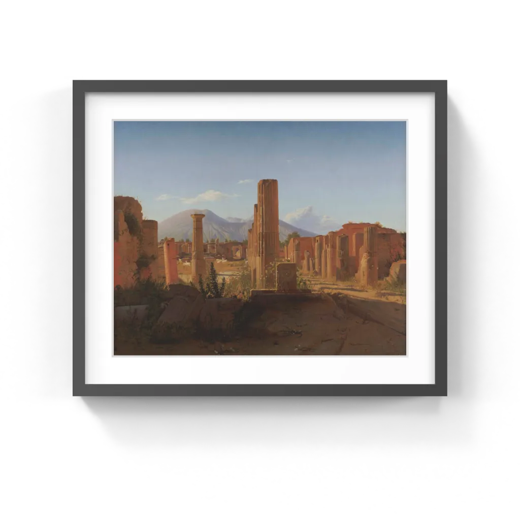 Christen Schjellerup Købke (Danish, 1810–1848) Under a brilliant, clear blue sky, a sense of stillness and abandonment prevails in this scene, reinforced by creeping vegetation, grazing goats, and lizards scurrying across a dirt path. Behind the ancient city of Pompeii, Vesuvius silently looms, its presence serving as a terrifying reminder of the havoc it wrought in A.D. 79, when the city and its residents were buried beneath its molten lava. Christen Schjellerup Købke drew the architectural remains of the forum with sharp precision, giving the painting a sense of order and clarity. He added a sense of drama by intensifying the contrast between light and dark, painting the foreground fragments almost completely in shadow.
