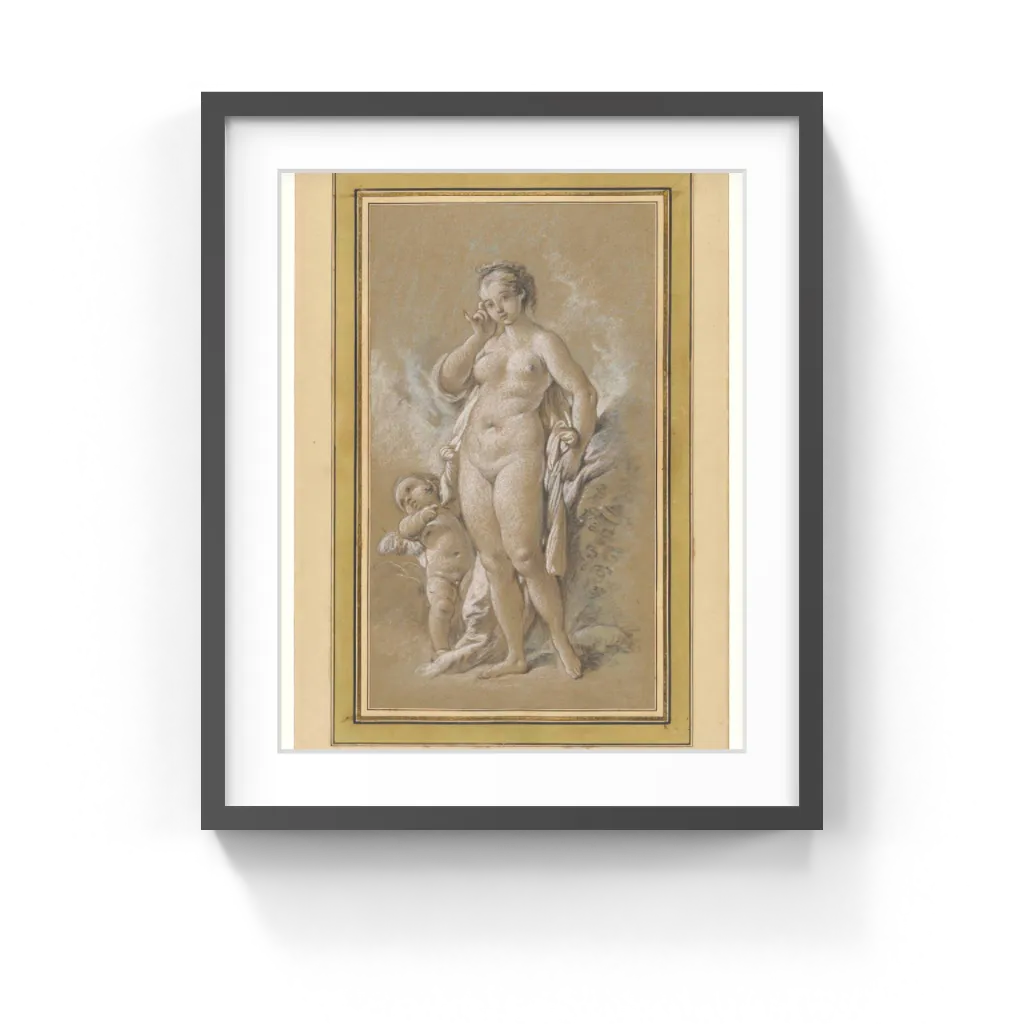 Venus and Cupidtypifies François Boucher's works both in its unselfconsciously erotic female nude and in its sensual use of the chalk medium. Until the 1700s, few artists had actively cultivated the powdery, floating qualities of chalks. Here the green