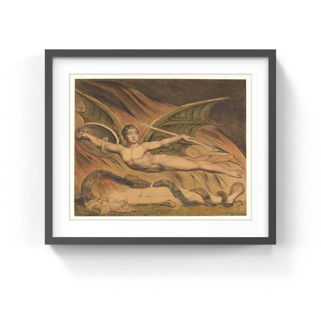 William Blake (British, 1757–1827) Satan hovers in malevolent glory over Eve, who is entwined by his alter ego, the serpent of the Garden of Eden. The uneven, fibrous, opaque color of the ground under Eve distinguishes this area as printed, while the even sweep of the red washes shows that the flames behind Satan are mostly watercolor, a medium William Blake often used because he liked its transparent quality.