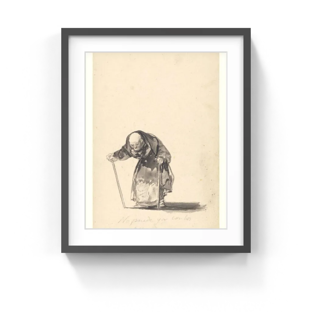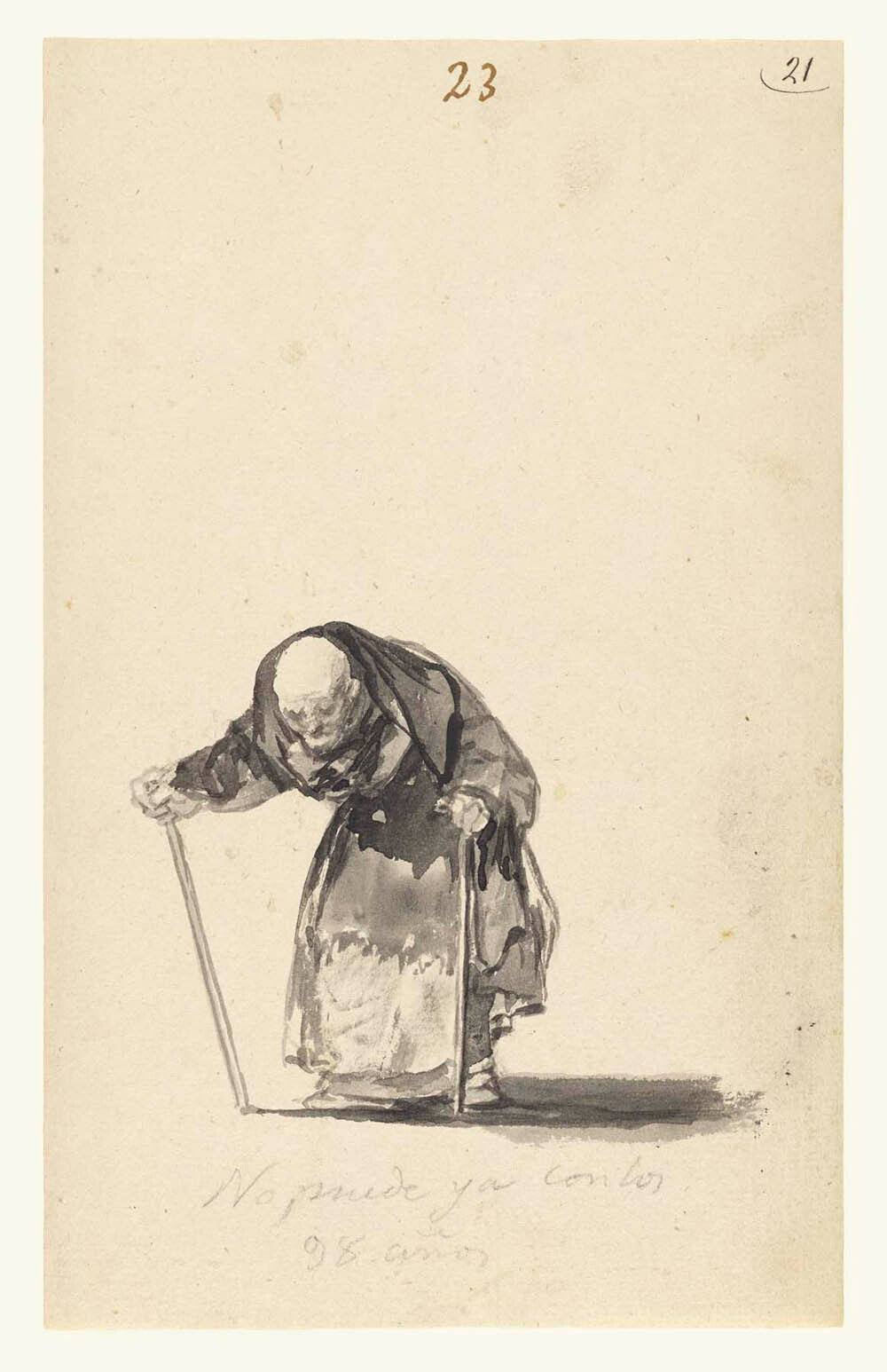 Francisco José de Goya y Lucientes (Francisco de Goya) (Spanish, 1746–1828) An extremely aged figure of a man hobbles along with two canes, overwhelmed by the weight of his own body. Drawn from life, the figure presents a universal image of old age, while the inscription flatly describes physical and mental frailty and hints at sexual impotence. Francisco José de Goya y Lucientes made the drawing at age sixty and had himself survived a serious illness; along with several other studies of old people, he included this drawing in his now-dispersed "Album D."