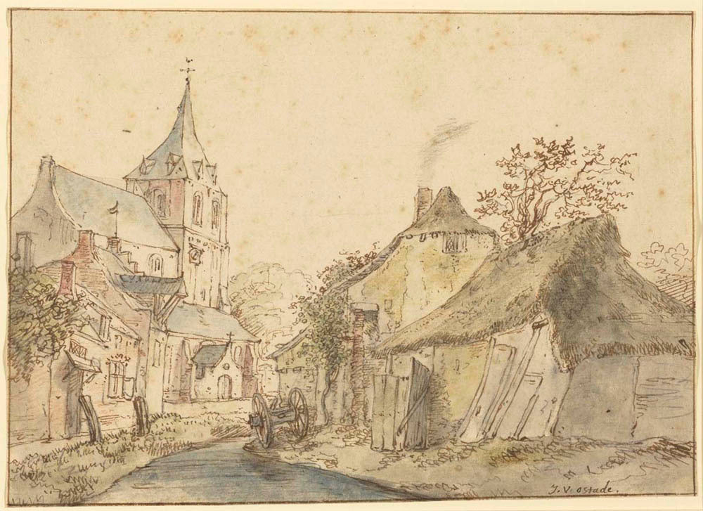 In his paintings, van Ostade specialized in large-scale summer and winter views of Holland that are usually crowded with figures. Here he instead focused on the charms of the rustic townscape.