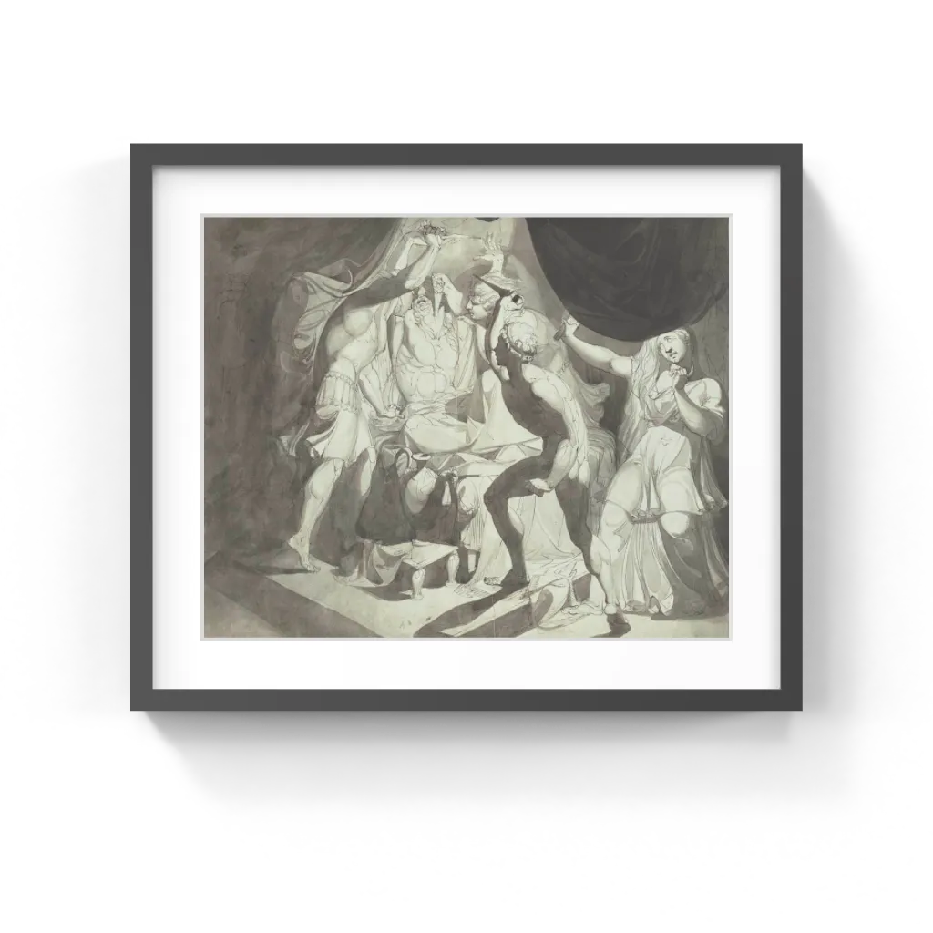 Fuseli selected his themes from literature, but his idiosyncratic interpretation can make it difficult to identify exact subjects. The curtain creates the stagelike effect, which, along with the linear, abstract representation of monumental figures, recall Fuseli's Shakespearean drawings of the early 1770s, made during his years in Italy. The classicizing representation of the figures may have been inspired by the Hellenistic sculpture Niobid Groupin the Galleria degli Uffizi in Florence.