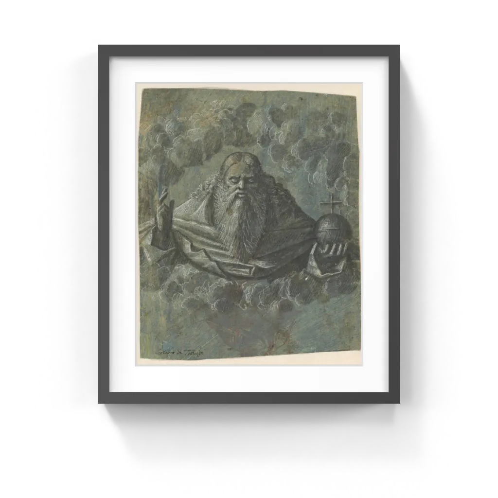 Vittore Carpaccio (Italian, about 1460–1526) Gazing downwards, God the Father grasps his celestial orb in one hand and watches over earth surrounded by a ring of clouds. Vittore Carpaccio first applied black chalk and gray wash, describing the figure's overall outline with strong strokes. Dark vertical lines of hatching give texture to God's robe as well as to the clouds. The artist then exploited the brilliance and luminosity of the white gouache by applying it on top of the chalk. With white lines, he delineated the long delicate hairs of God's beard, differentiating them from the curling strands on his head. The glowing quality of the white gouache and the solid three-dimensionality of God's form create a sense of energy radiating from him.