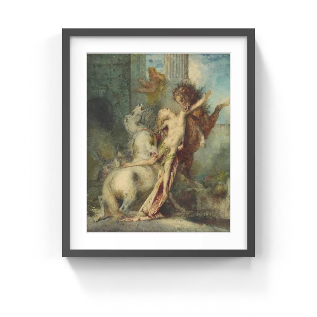 Gustave Moreau (French, 1826–1898) As the shadowy figure of Hercules observes from between two columns in the background, four wild horses rip apart the slender body of King Diomedes. The brown mare fastens her teeth on his arm, while another sinks her jaw into his leg. Bodies of the horses' previous victims lie piled to the right, above a pool of blood-stained water. This scene shows the dramatic climax from the eighth labor of Hercules, who was ordered to capture the four flesh-eating horses belonging to King Diomedes. Hercules killed the king in battle and fed his body to the horses, which tamed them. Gustave Moreau's fascination with violent, emotionally charged subjects portrayed in jewel-like colors typifies mid-1800s French painting. Here Moreau's luminous and delicately applied watercolor washes enhance an already dramatic scene, highlighting the vertical body of the doomed Diomedes, whose extended, stretched limbs repeat the dynamic rearing motion of the brown horse's front legs. In calm contrast, Hercules rests in the background, silhouetted against a blue sky subtly rendered with light patches of wash.