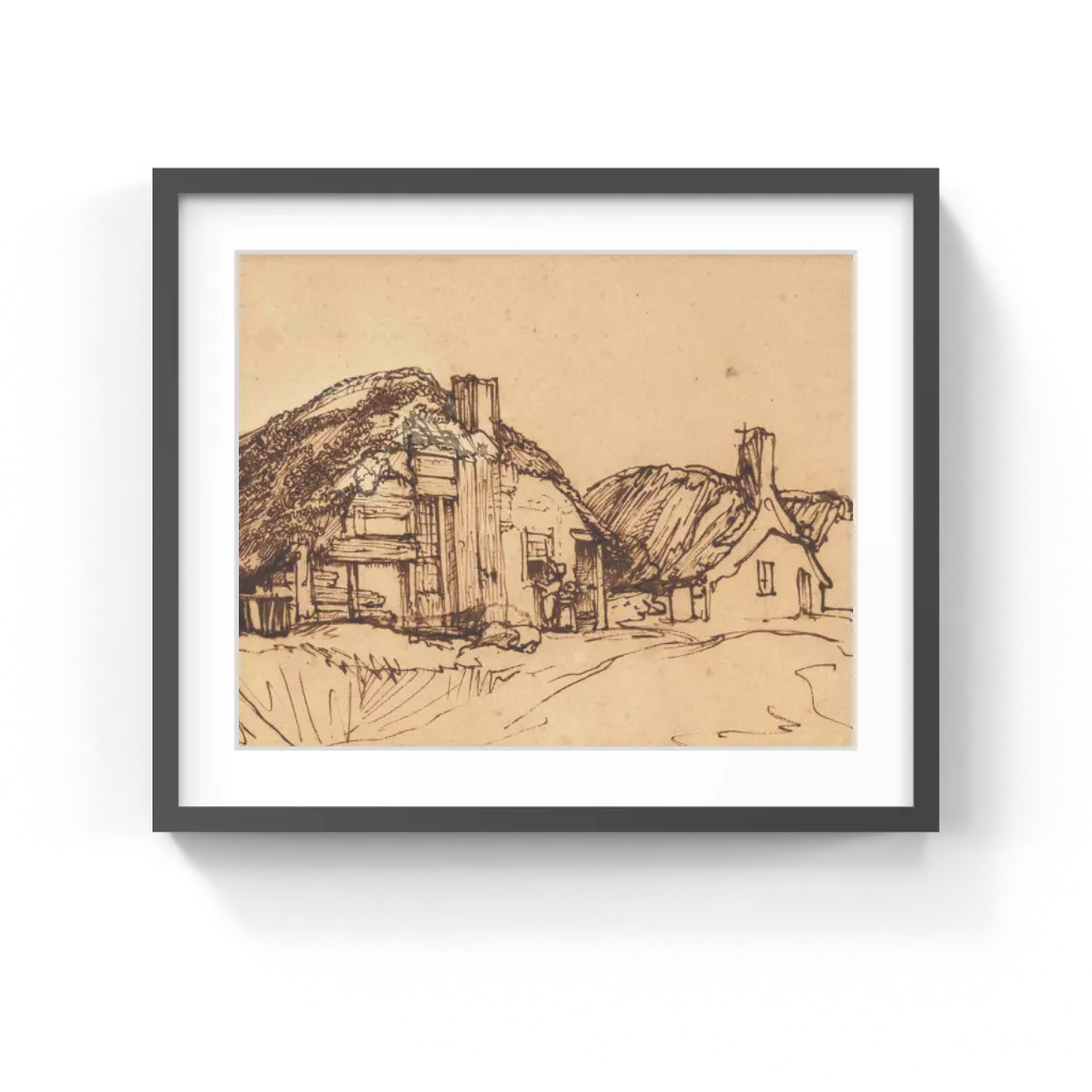 Rembrandt Harmensz. van Rijn (Dutch, 1606–1669) Around 1640, Rembrandt van Rijn made five drawings, similar in setting and technique, of these two thatched cottages. Unlike most of his landscapes, this drawing almost entirely eschews atmospheric effects in favor of building up monumental architectural and textural forms with bold strokes of the quill pen. The larger house's monumentality and detail contrasts with the cursory jottings that compose the neighboring house and the few squiggly lines that indicate the earth.