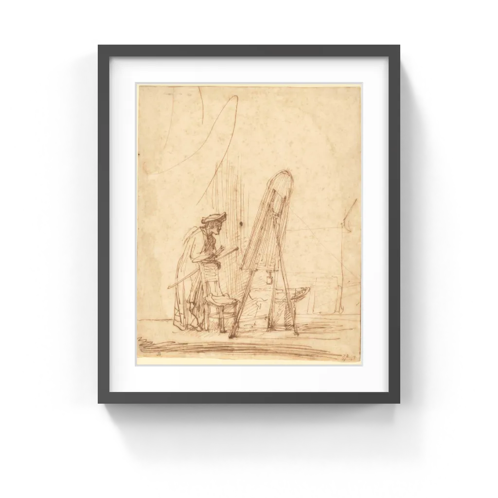Some scholars have labeled this drawing as a self-portrait in which Rembrandt himself views a panel from a distance, developing a mental image of the whole picture before he begins to work. Alternatively, other scholars argue that it depicts Rembrandt's friend and fellow Leiden artist Jan Lievens, who began his pictures by making a rough sketch in paint directly on the canvas.