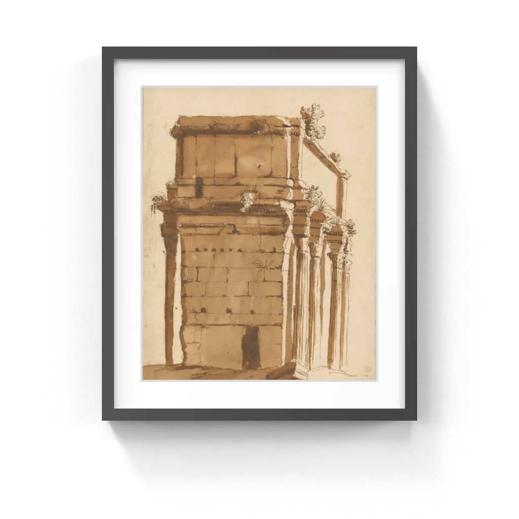 Cornelis van Poelenburgh (Dutch, about 1594/1595–1667) After choosing this unusual side angle on the arch of Septimius Severus, Cornelis van Poelenburgh concentrated on the contrasting patterns of sunlight and shade on the structure. He juxtaposed broadly washed areas of deep shadow with brilliantly illuminated passages articulated by the white paper. His interesting choice of an oblique view of the arch, highlighting the narrow columns, and his omission of several architectural features allowed Poelenburgh to treat it as blocks of light and shadow rather than as a specific structure. Clusters of vegetation growing through cracks in the stonework, formed with simple, looped strokes, appear as the only distraction.