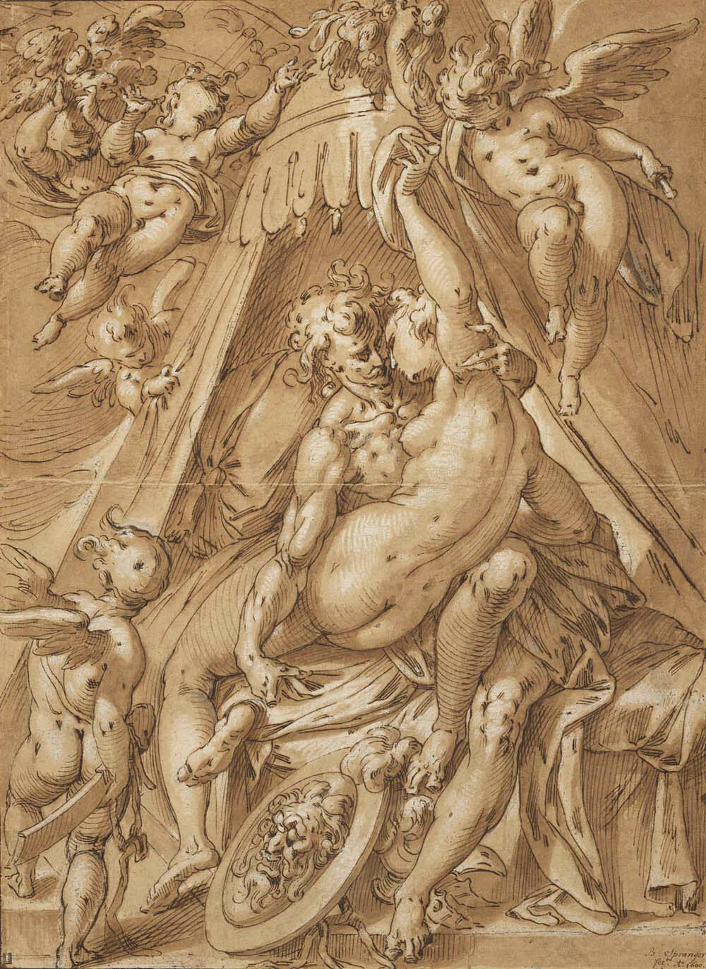 Abraham Bloemaert used the body of Venus as the drawing's central feature. As she curves around Mars, her body forms a grand diagonal sweep that flows up through the drawing, leading the viewer's eye up to the top of the canopy. Bloemaert's deft handling of his materials and his technique give the scene immediacy and vigor. By varying the length and the curve of the same strokes of parallel hatching, he indicated both the lighting and the volume of the forms. The white