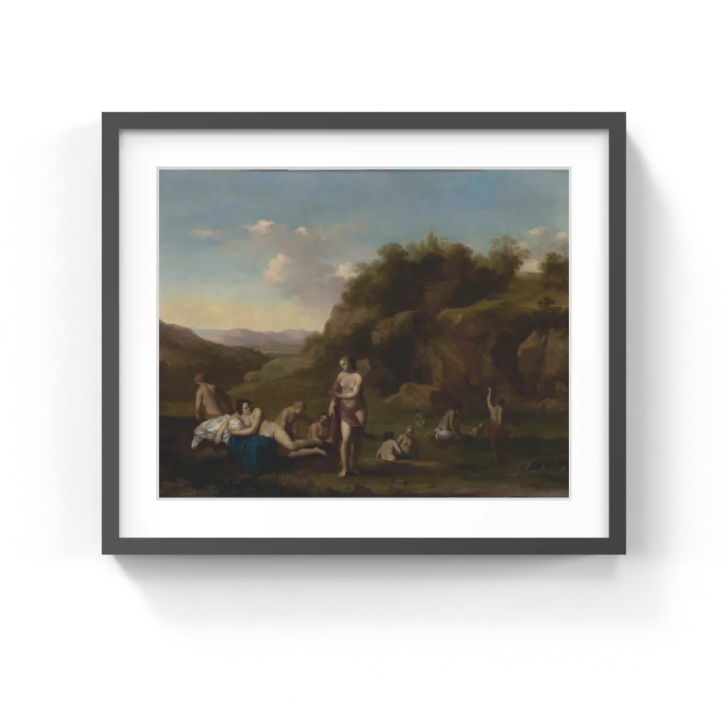 Cornelis van Poelenburgh (Dutch, about 1594/1595–1667) A sense of uninhibited freedom pervades the scene as a group of women bathe, lounge, and socialize in an area below a rocky hillside. Drying herself, the woman in the center of the painting turns toward her voluptuous nude companion lying in the