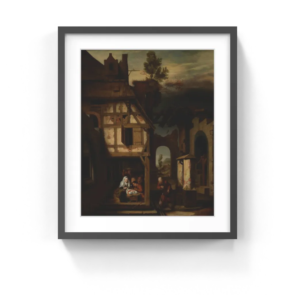 Nicolaes Maes (Dutch, 1634–1693) In this painting, Nicolaes Maes almost exactly copied Albrecht Dürer's 1504 engraving of the Nativity. Maes simply widened the house to the left, provided new poses for the Virgin Mary and baby Jesus, and added the four shepherds that give the painting its new subject. The harmony of blacks, browns, and whites that he chose emphasizes the painting's print origin. He successfully used the fluid medium of oil paint to render such textures as the stable's wooden door, the exposed bricks, and the thatched roof.