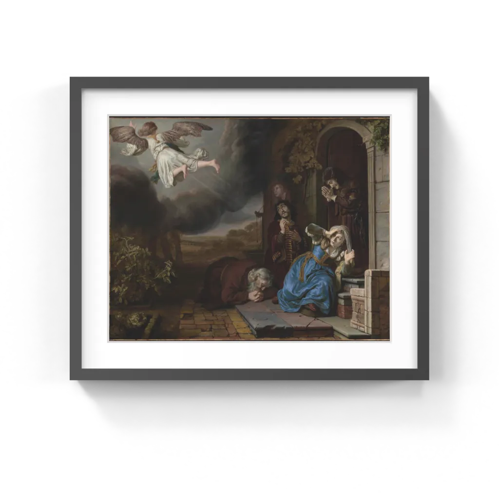 Jan Victors (Dutch, 1619–after 1676) After curing Tobit's blindness, returning the family's wealth, and making it possible for Tobit's son Tobias to marry his beloved Sarah, the Archangel Raphael has dropped his disguise and revealed himself as an angel, saying, "I was not acting on my own will, but by the will of God." Such a scene of miraculous intervention was especially attractive to Protestants in Holland, who believed in doctrines of faith, mercy, and divine grace.