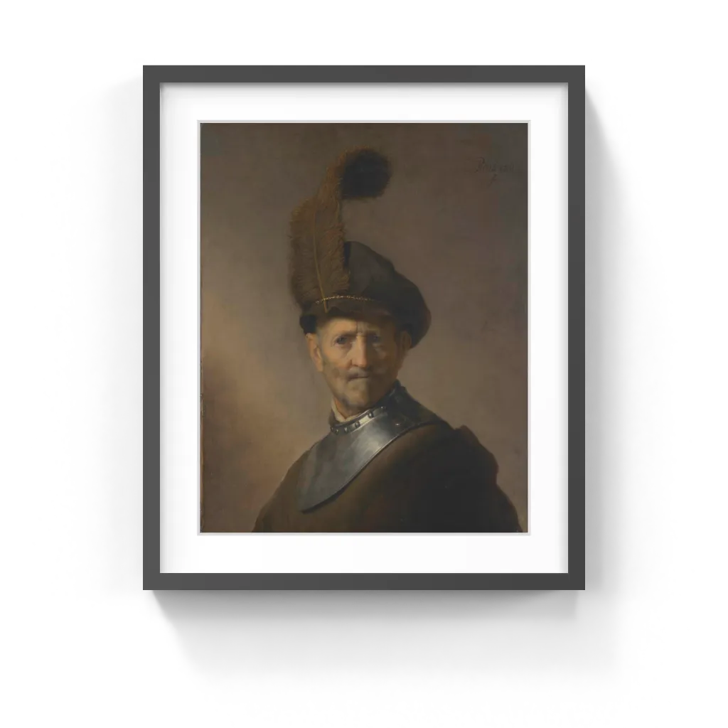 Rembrandt Harmensz. van Rijn (Dutch, 1606–1669) The subject, who appears in different guises in several other paintings by Rembrandt van Rijn and his contemporaries, wears a plumed hat and metal breastplate. His military costume may symbolize Dutch strength and patriotism during the struggle for independence from Spain. Although he faces front, the man's torso is turned in a three-quarter view; his watery eyes gazing off to the side give the image a sense of immediacy.