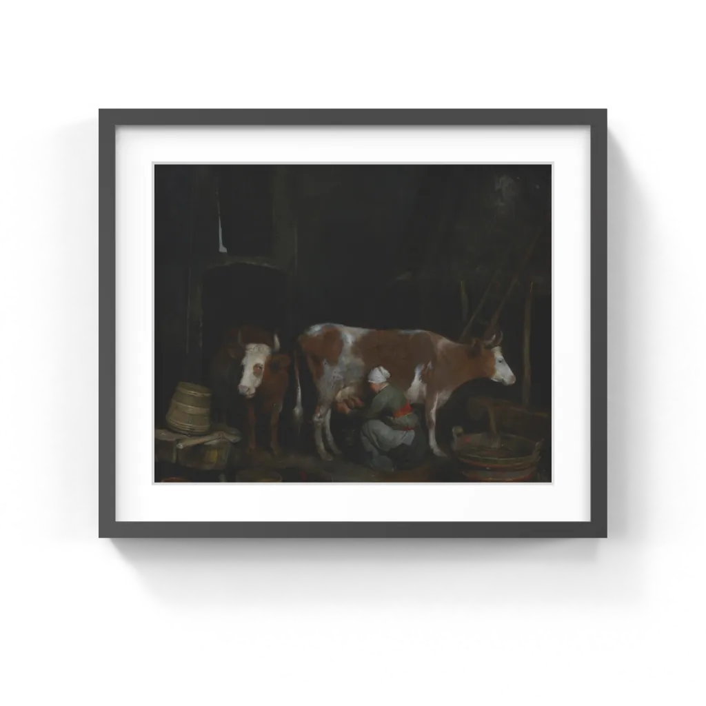 Gerard ter Borch (Dutch, 1617–1681) In a barn, a young maid squats while milking a brown and white spotted cow. Standing nearby, another cow seems to be waiting its turn. Gerard ter Borch treated the routine chore of milking in a straightforward manner, rejecting the humorous themes often favored by seventeenth-century Dutch