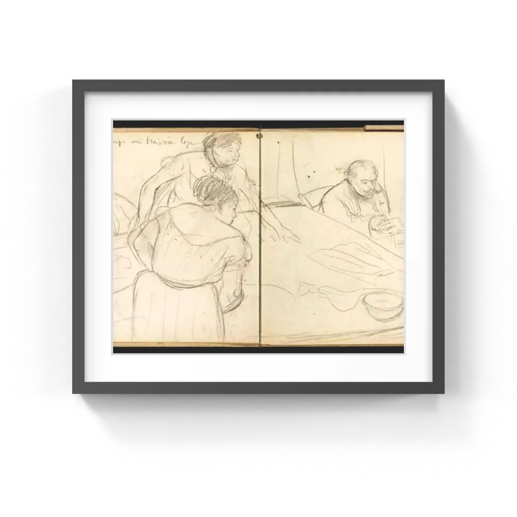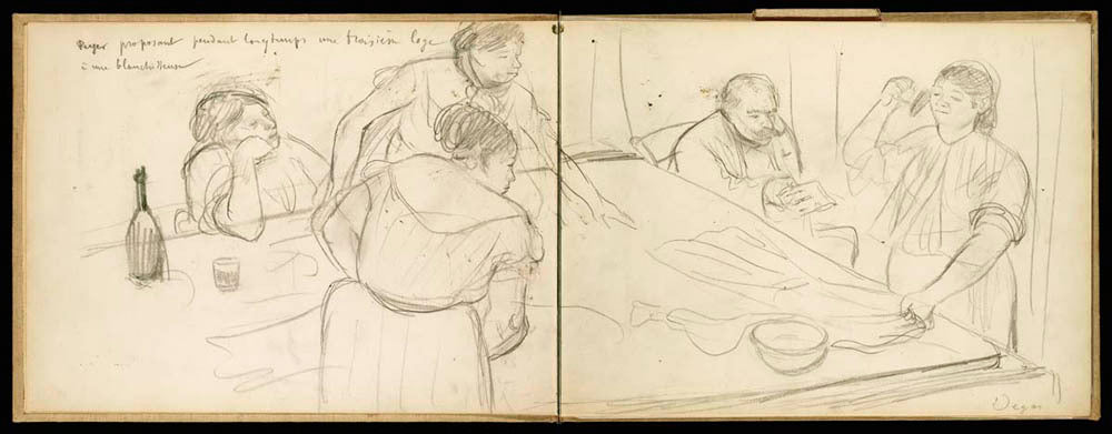 Edgar Degas (French, 1834–1917) Across two pages of his sketchbook, Edgar Degas drew the composer Ernest Reyer sitting at a long table among four washerwomen. The numerous gestures that revealed an individual's class and work fascinated Degas, and he focused on the laundresses' expressive faces and bodies. One woman rests her head on her hand, with a bottle and a half-empty glass beside her, her eyes closed either in exhaustion or an alcoholic stupor. The other two lean forward, absorbed in the developing relationship between the composer and the woman ironing. Reyer's intense gaze contrasts sharply with the studied indifference of the object of his attention.