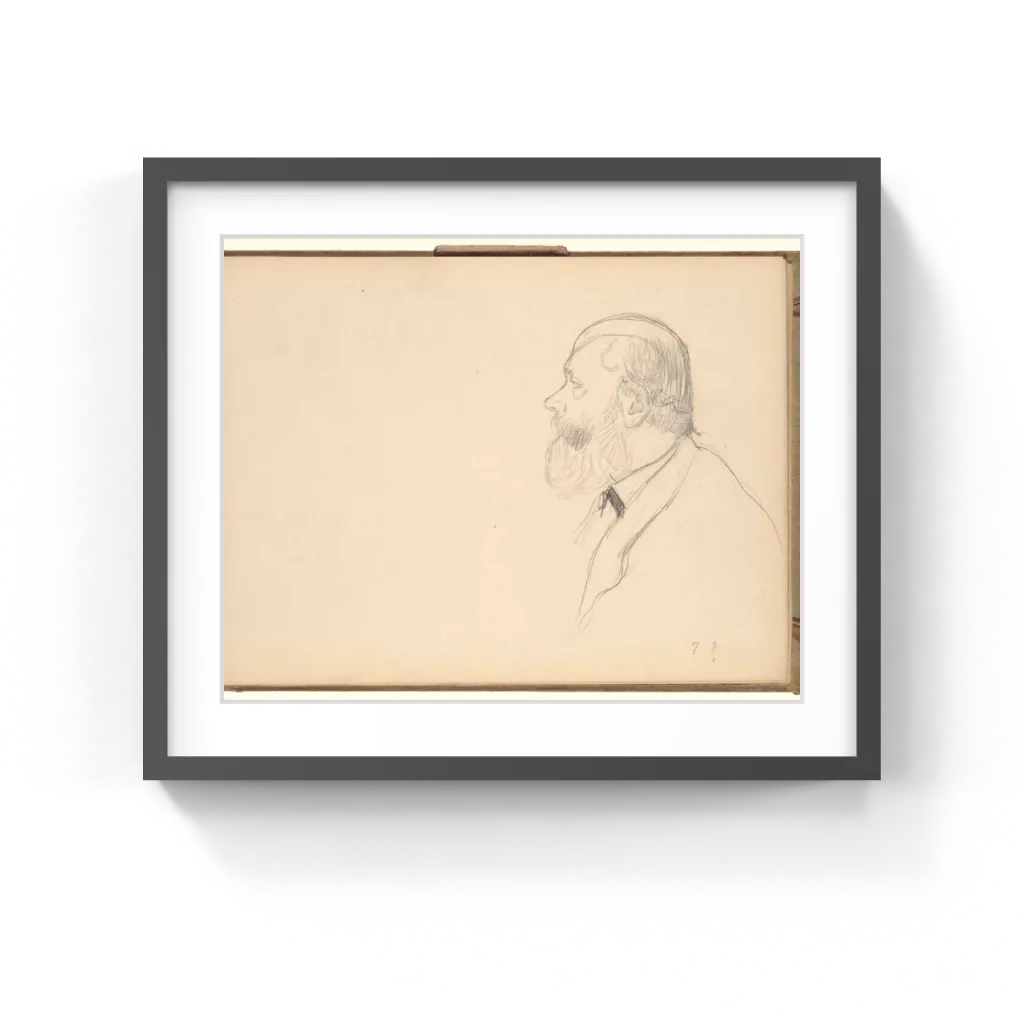 Edgar Degas (French, 1834–1917) An unknown man stares out to the left, drawn in a sharp profile that emphasizes his high-domed head and projecting beard. Edgar Degas first drew him with a much smaller head, then raised up his forehead and skull, giving the man a more substantial presence. Quick, parallel lines form the sitter's dark mustache, while softer, curving strokes create the paler wisps of his beard. Degas only lightly sketched in his subject's clothing, with merely a few lines to indicate the rounded collar of a dinner jacket and a black necktie.