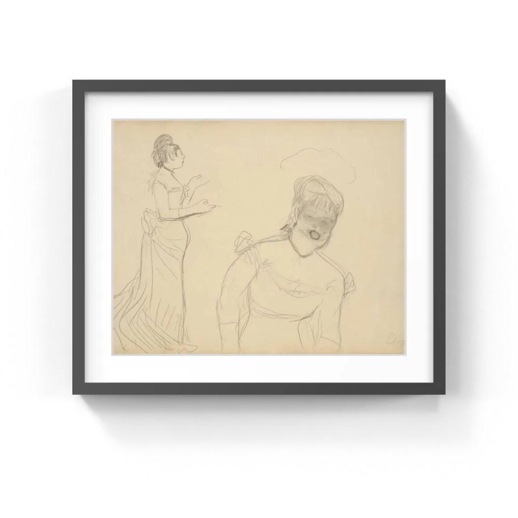 Edgar Degas (French, 1834–1917) During the year that he took to fill this sketchbook, Edgar Degas became fascinated with the singers who gave concerts in the cafés that he visited, filling numerous pages with images of them. Here he experimented by showing the robust curves of different café singers from various angles. On the left one singer gestures emotionally. Hastily drawn parallel lines suggest the folds of her dress as it puddles on the floor around her feet and bunches at her hips. The singer on the right opens her mouth in full song. A smudge across her face casts it into shadow and makes the rest of her body appear in brilliant relief.