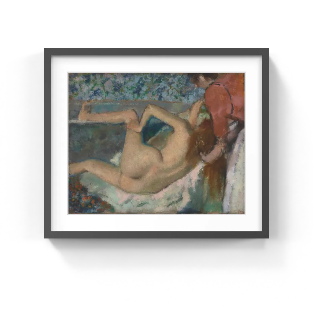 The intimate subject of this painting, a woman bathing in a private interior, is one that invites voyeurism. Degas depicted the woman lying on a divan, while her maid dries or combs her hair. With her back pushed to the extreme foreground of the images, she seems to hold the viewer at bay. Bracing herself with her left arm, the woman uncomfortably raises her left leg against the edge of the bathtub. Such unnatural poses have perplexed critics of Degas's time, as they do viewers today. Some see these poses as an attempt to depict human movement not in idealized forms, but in ordinary, private behavior. Others see such representations of women as misogynistic.