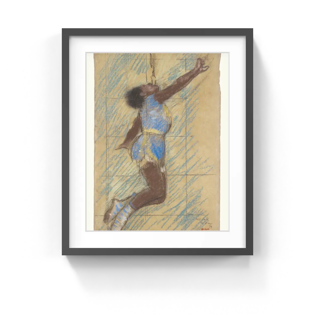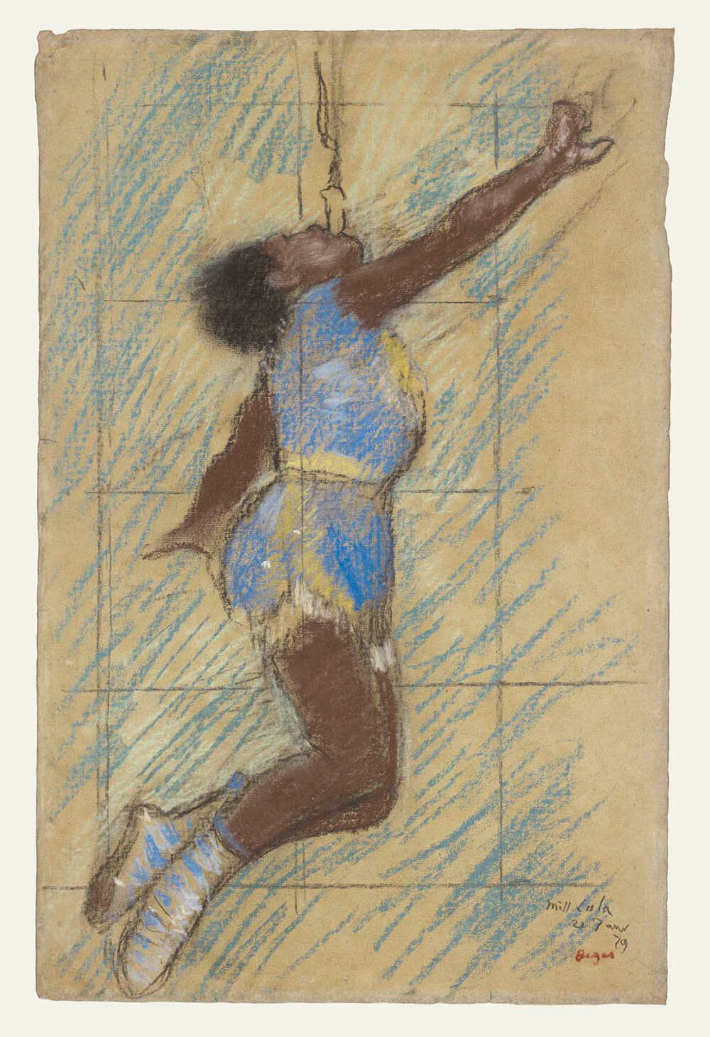 Edgar Degas (French, 1834–1917) Edgar Degas captured the circus performer Miss Lala in her most thrilling act: clenching a bit between her teeth, she is hoisted slowly to the circus rafters. Her strength and concentration are conveyed by the diagonal sweep formed by her outstretched arms. The gestural strokes surrounding her body echo this diagonal. Degas's color palette heightens the dramatic effect; shades of electric blue contrast powerfully with Miss Lala's brown skin punctuated by a shock of black hair.