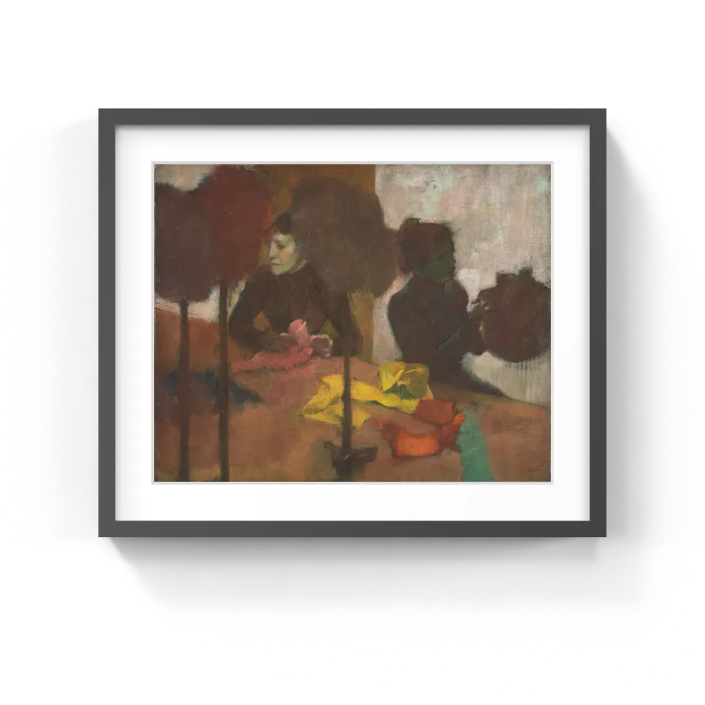 Edgar Degas (French, 1834–1917) Two milliners sit at a dramatically angled worktable, their bodies partly obscured by the shadowed hat stands that crowd their work space. Seen as little more than a silhouette, the figure at right works carefully on a hat. Her attentiveness is not shared by her older counterpart who, though grasping a swath of pink fabric, appears lost in thought, gazing beyond the frame with a disquieting expression. The brightly colored ribbons--pink, yellow, orange, and green--draw attention to the drabness of the room and its inhabitants.