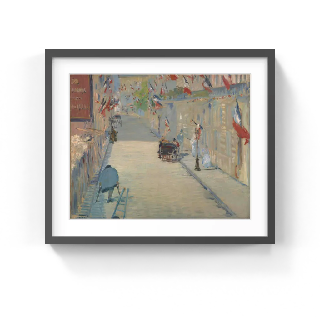Édouard Manet (French, 1832–1883) To commemorate the recent Exposition Universelle, itself a celebration of luxury and prosperity, the French government declared June 30, 1878, a national holiday. The holiday, called the Fête de la Paix (Celebration of Peace), also marked France's recovery from the disastrous Franco-Prussian War of 1870-1871 and the bloody, divisive Paris Commune that followed. From his second-floor window, Édouard Manet captured the holiday afternoon with his most precise, staccato brushwork in a patriotic harmony of the reds, whites, and blues of the French flag that waves from the new buildings' windows.