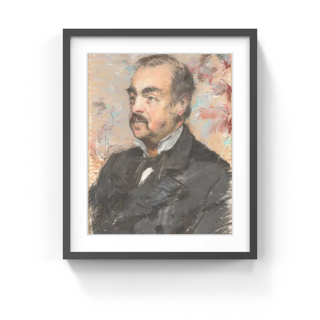Édouard Manet (French, 1832–1883) While known as one of the greatest painters in 19th-century France, Édouard Manet was also one of the most innovative pastel artists of his era. Here he depicted the animal painter Julien de la Rochenoire, an old friend who had likely dropped by Manet's studio. Dashing strokes of salmon and black animate the sitter's bewhiskered face, while the swirling background wallpaper evokes his psychological energy. The majority of Manet's surviving pastels are portraits of friends, which accounts for their intimacy of mood and their spontaneous handling of the powdery medium.
