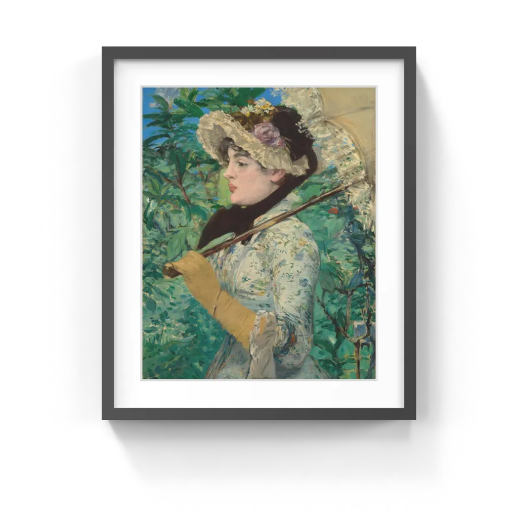 Édouard Manet (French, 1832–1883) A chic young woman in a day dress with floral accents holds a parasol against a background of exuberant foliage. She looks straight ahead, a picture of poise and detachment even as she seems fully aware of the viewer's admiring gaze. Representing aspiring Parisian actress Jeanne Demarsy as the embodiment of Spring, this portrait debuted at the last major public exhibition of Manet's life, the Paris Salon of 1882. For more than two decades, Manet's paintings were rejected by the Salon or met with controversy; Spring was the most unalloyed success of the artist's Salon career, a career that ended tragically a year later when Manet died of causes related to syphilis.
