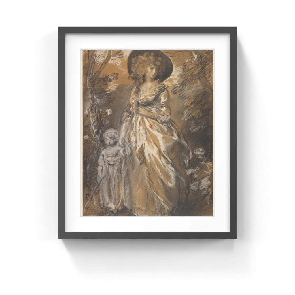 Thomas Gainsborough (English, 1727–1788) Although their identity is unknown, the lady and child strolling through a park are probably portraits of specific members of English high society. The woman wears a large picture hat, and her hair flows in loose ringlets over her shoulder, a hairstyle very much in vogue in England between 1785 and 1790. Sweeps of black chalk with fresh white