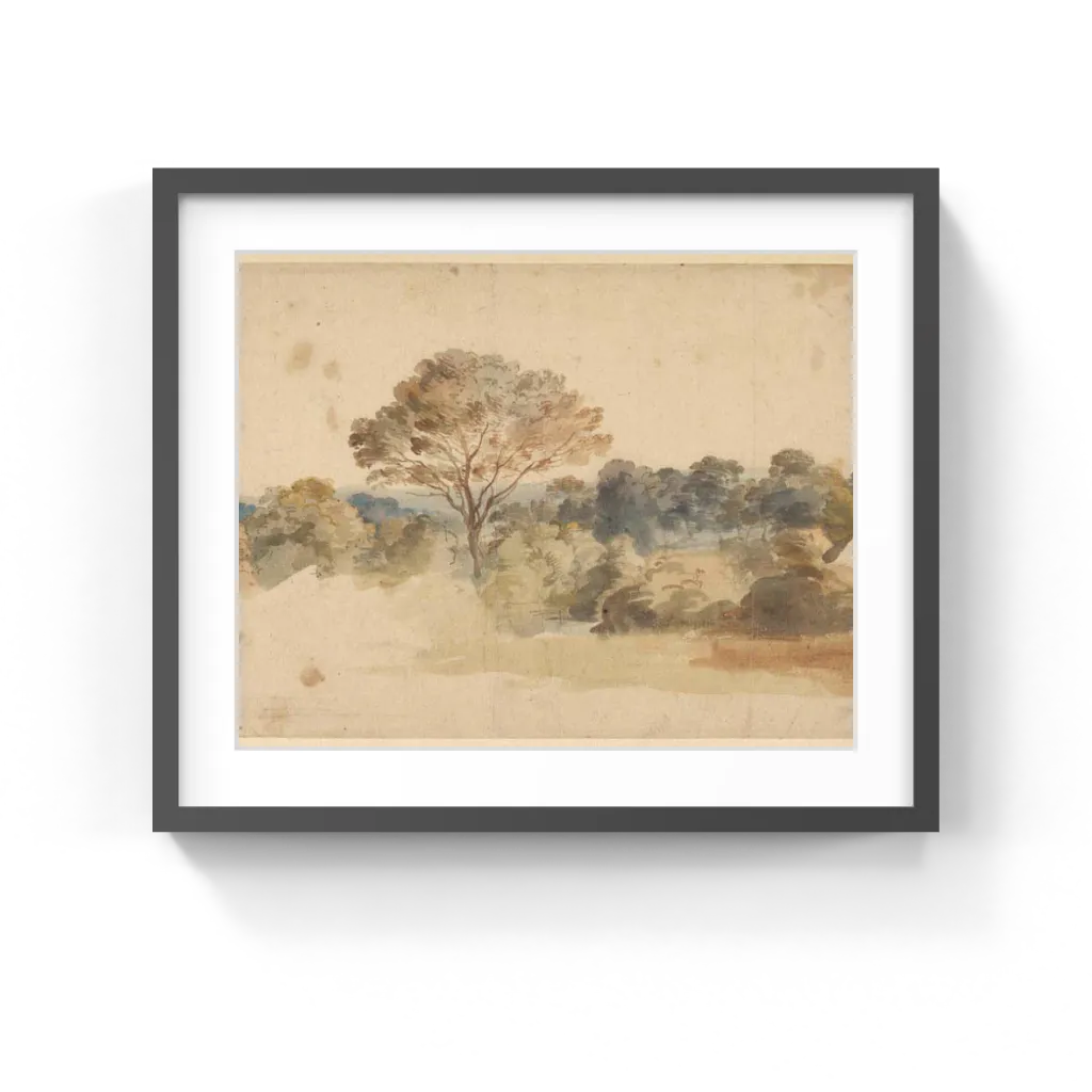 Anthony van Dyck (Flemish, 1599–1641) Amidst the soft, feathery trees in this English landscape, a subtly rendered house at the right suggests a human presence. Though this country view seems spontaneous, the scene is thoughtfully arranged around the prominent central tree. Anthony van Dyck's rich and translucent colors and the freshness of his watercolor and pen accents lend an almost impressionistic tone to the drawing.