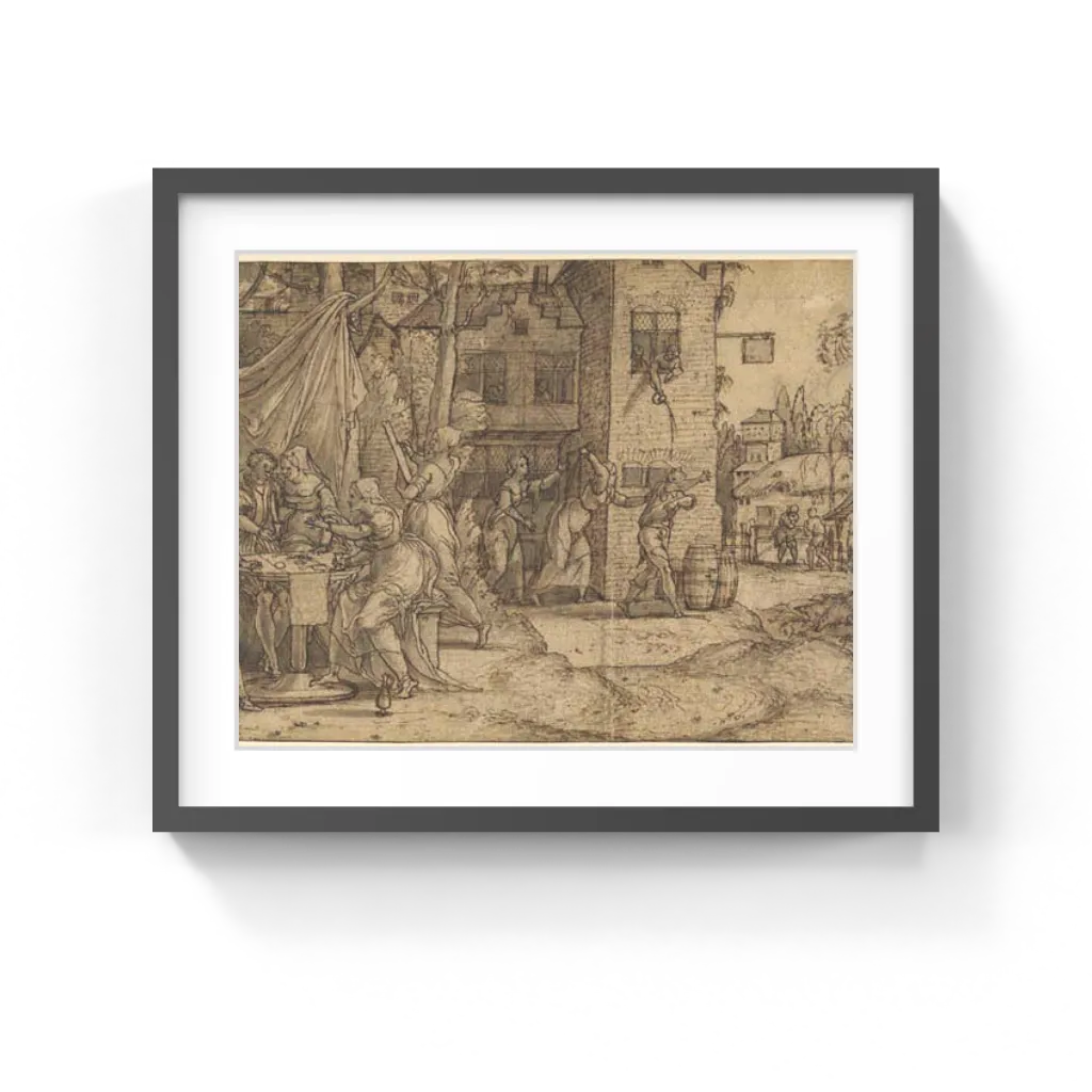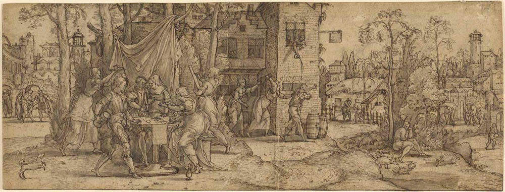 Master of Saint Christopher (Flemish, active first half of 16th century) Pieter Coecke van Aelst combined various scenes into a continuous narrative that proceeds left to right like a cartoon strip. The prodigal son takes leave of his father, lavishes his money on worldly pleasures at a brothel, gets chased away by prostitutes, lands in a pigsty, and finally reconciles with his father. In the 1500s, this popular parable taught about the sin of extravagance and the virtue of forgiveness. In contrast to the text of the Bible, which emphasizes the father's final act of forgiveness, artists and patrons of that period often focused lively attention on the brothel scene. Coecke set it further forward than the rest of the action, with the detailed landscape and architectural passages of the other episodes forming an elaborate backdrop. Emphasizing attractive outlines, he filled the entire drawing with elegantly proportioned figures. Scholars believe that the drawing's large scale and horizontal format suggest that Coecke might have made it as a tapestry design.