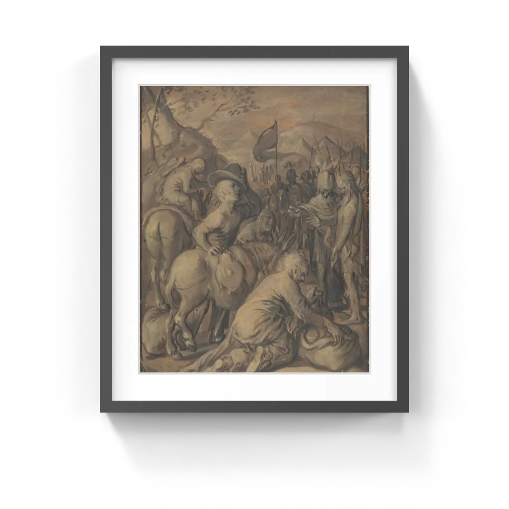 Joachim Beuckelaer (Netherlandish, about 1534–about 1574) To save their people from destruction by the advancing army of the Israelites, three Gibeonite men gather in the foreground to plead with Joshua. They lie to him, displaying their old food, ripped wine sacks, and tattered clothing, in a ploy to convince him that they are wandering tribes that should be allowed to stay in the Promised Land of Israel. When Joshua learns that he has been tricked--in fact the Gibeonites lived there permanently--he condemned them to perpetual servitude.