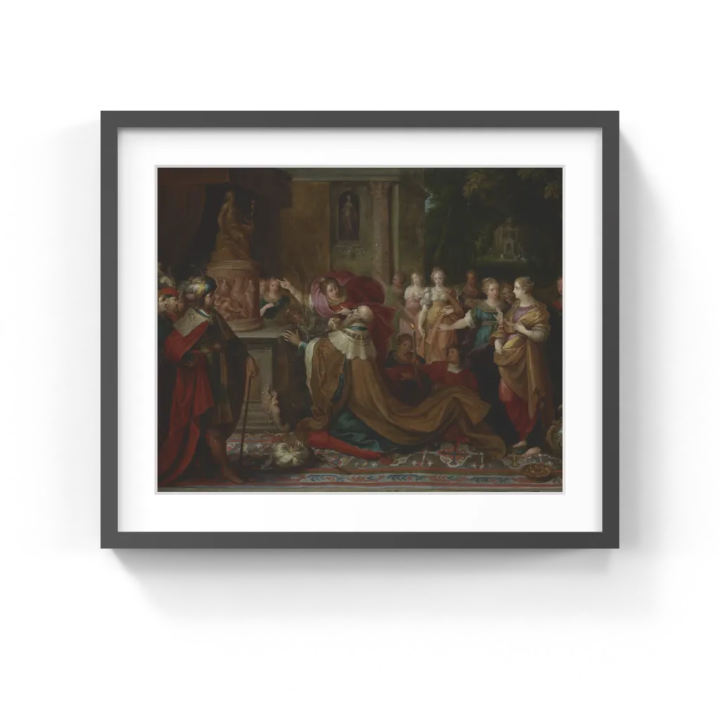 Frans Francken the Younger (Flemish, 1581–1642) Wearing a magnificent silk robe with an ermine lining, King Solomon kneels and makes an offering to a pagan