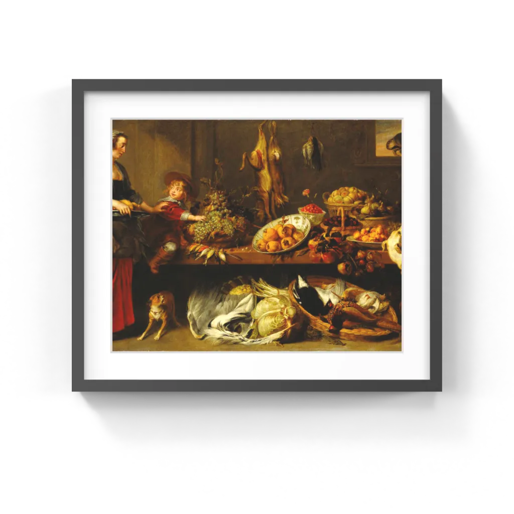 Pantry scenes like this were derived from earlier paintings of town markets, which were appreciated for their display of nature's bounty. This painting is a collaborative work by Frans Snyders, who specialized in still lifes and animal subjects, and Jan Boeckhorst, who painted the figures.