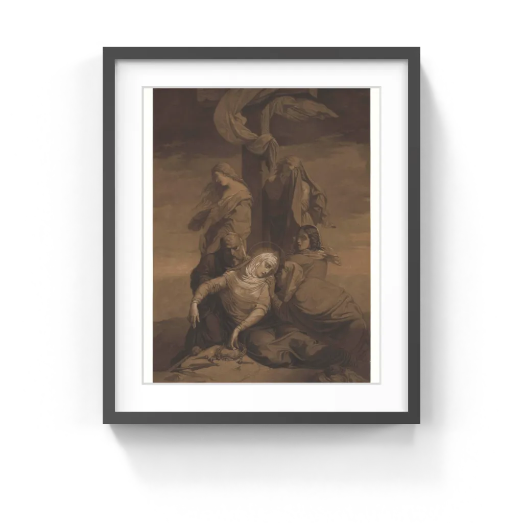 Virgin Mary swoons in a faint at the foot of the cross, surrounded by
