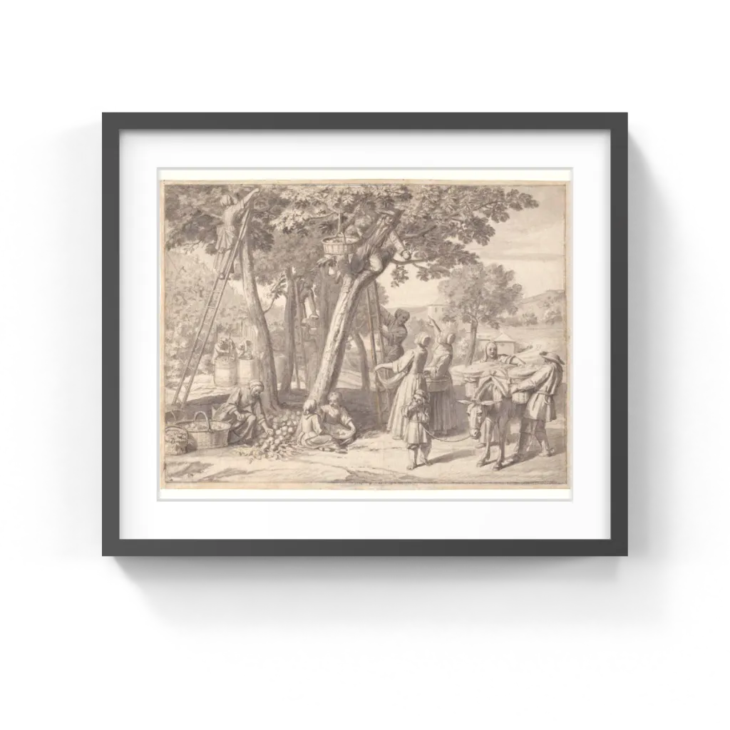 Claude Simpol (French, 1666–1716) Despite its rustic subject matter, this highly finished drawing displays many elements of the classicizing style of French art, which Jacques Stella absorbed during his close association with Nicolas Poussin in Rome. Stella lined up the figures in a loose, friezelike fashion, allowing the composition almost to be "read" from left to right. The calm, somewhat static effect and the shallow space, in which depth is cut off by the large trees and ladders, also characterize the classicizing style.