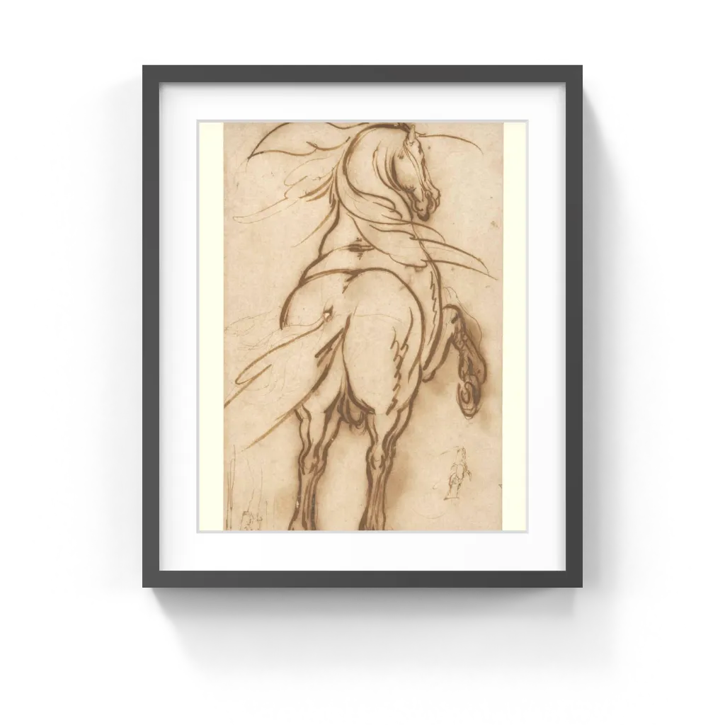 Upon completing the large stallion, Callot returned to the quill pen to execute the tiny equine figure in the lower right. More fluid still, the horse and rider capture the movements of its larger counterpart in remarkable detail, down to the glimpse of the underside of the front left hoof between the horse's hind legs. The drawing demonstrates Callot's marvelous capacity to miniaturize