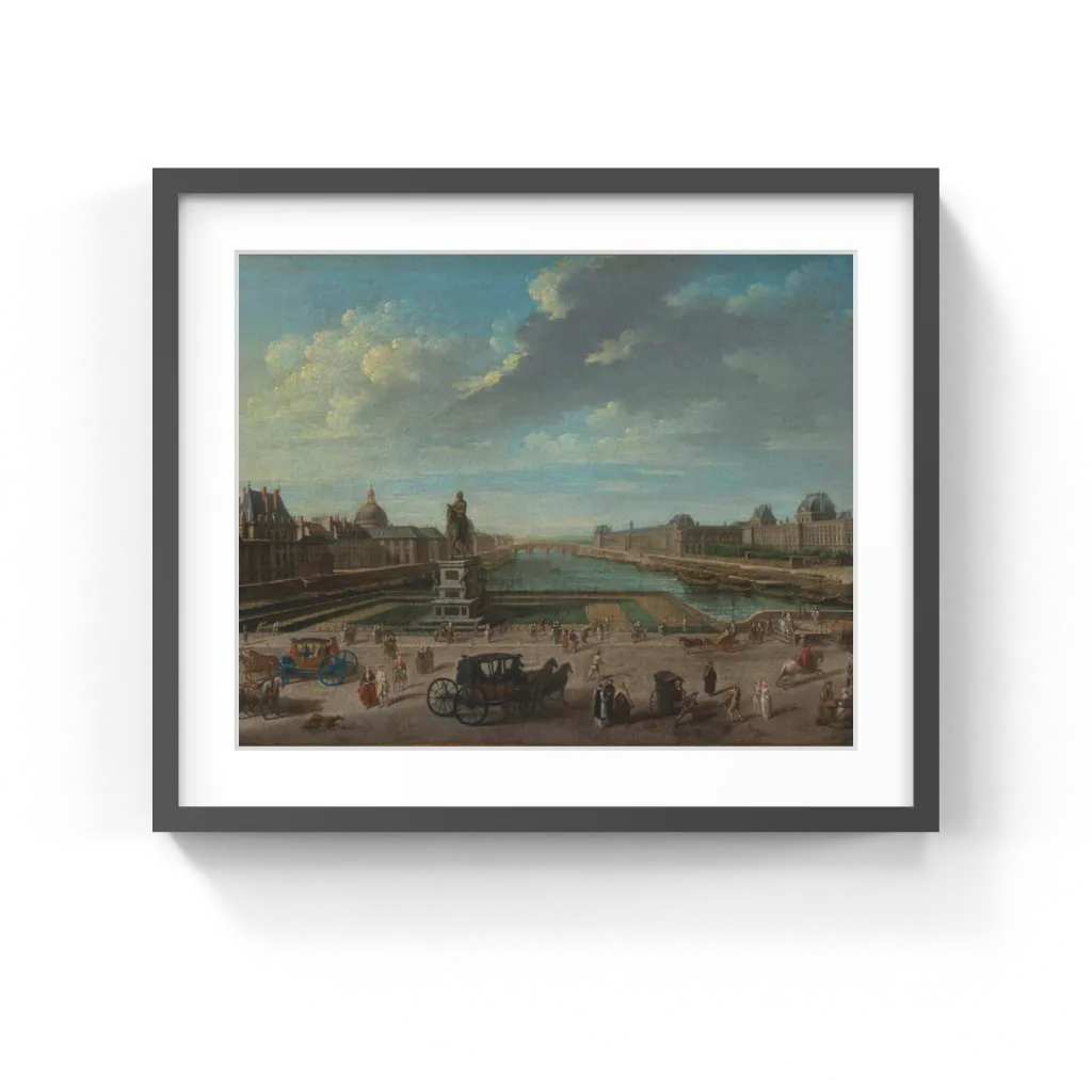 Jean-Baptiste Raguenet (French, 1715–1793) Horse-drawn carriages and strolling couples make their way across the Pont Neuf, one of the oldest bridges in Paris. Boats are tied up on both sides of the Seine River, a heavily traveled thoroughfare. In the center, behind an iron fence, stands an equestrian statue of Henri IV. On the right bank of the river is the Louvre, the national museum and art gallery of France. The dome of the Hôtel des Invalides can be seen on the left bank in the distance.
